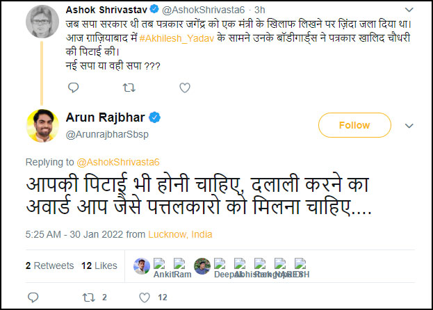 In his tweet, Shrivastav said, “Today Akhilesh Yadav’s security personnel beat up a journalist, I wrote against it, OP Rajbhar Ji’s son Arun Rajbhar Ji threatened to beat me up.” He further urged Home Minister, UP Police and Election Commission to take action against Rajbhar. “Please take action in this matter. This is an attack on the media on journalists,” he added.