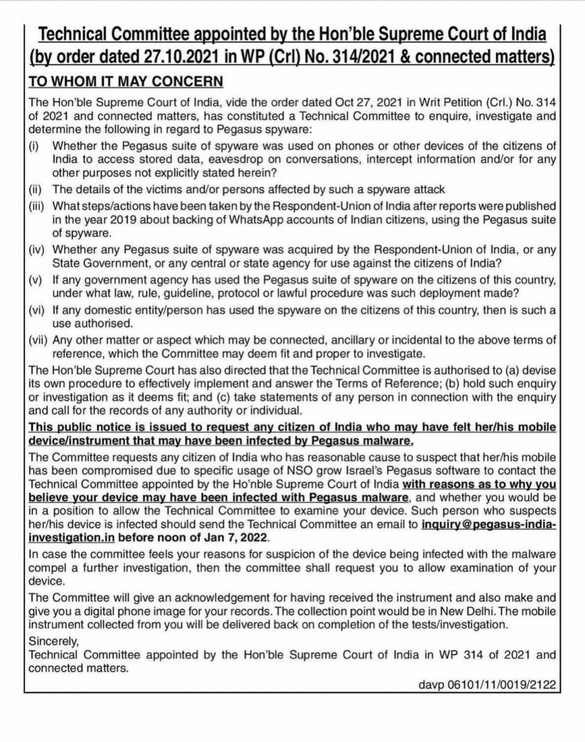 The committee will also investigate whether any Government agency – State or Central or any domestic private player has used this suite of software to date. The court has issued a public notice asking individuals to submit their mobile phones for examination who think their devices have been comprised or whether under any circumstances their devices have come under the Pegasus radar. The deadline set for issuing complaints is set January 7, 2022. An email in this regard could be sent to [email protected].