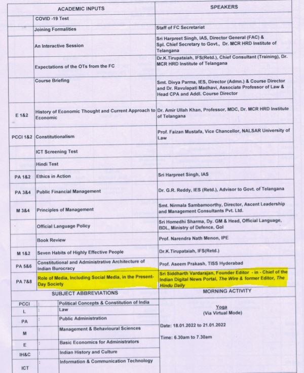 A closer look at the event schedule of the first week reveals that the Telangana institute has invited the far-left Siddharth Varadarajan on January 21 to address the trainees. He will be speaking virtually on the ‘role of media, including social media in present-day society.’