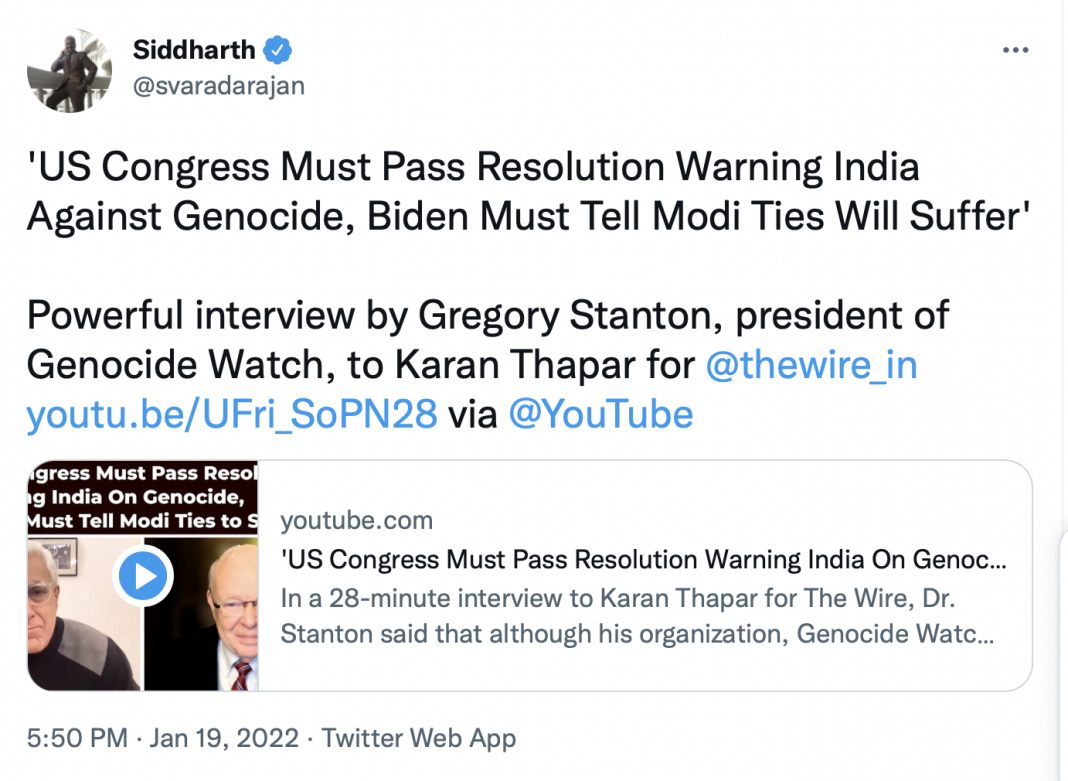 Recently, sharing an interview by Gregory Stanton, president of ‘Genocide Watch’, to Karan Thapar for The Wire, the founding editor of the leftist propaganda website had openly asked the US to place sanctions on India. ‘US Congress Must Pass Resolution Warning India Against Genocide, Biden Must Tell Modi Ties Will Suffer’, Siddharth Varadarajan had Tweeted.