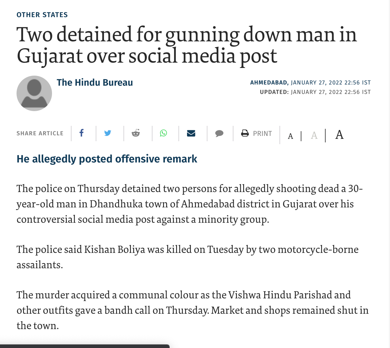 “The murder acquired a communal colour as the Vishwa Hindu Parishad and other outfits gave a bandh call on Thursday,” the report titled ‘Two detained for gunning down a man in Gujarat over social media post’ said.