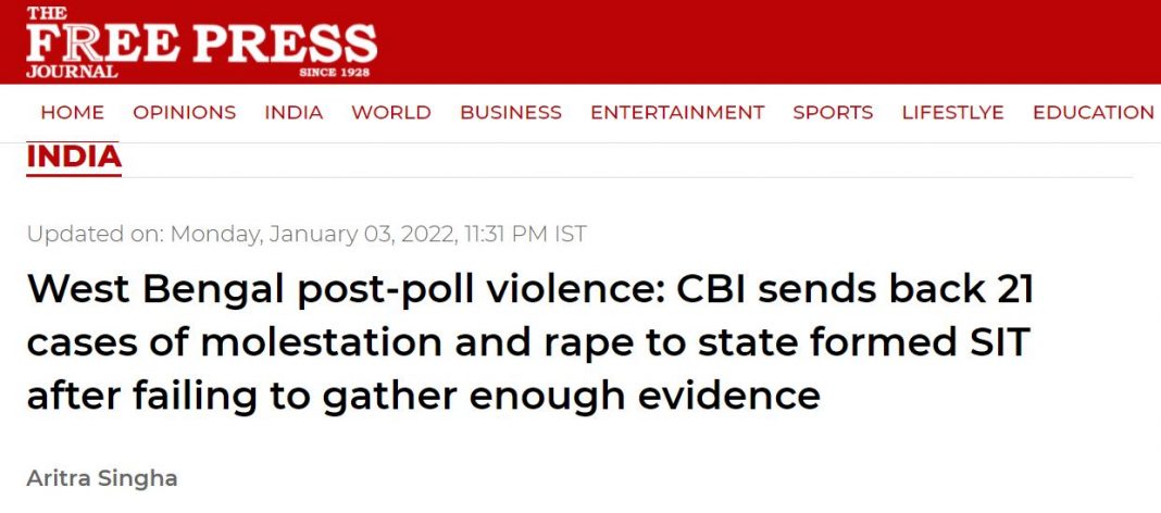 A cursory read, however, reveals the truth. The Free Press Journal published a report on January 3 that was titled: “West Bengal post-poll violence: CBI sends back 21 cases of molestation and rape to state formed SIT after failing to gather enough evidence”.