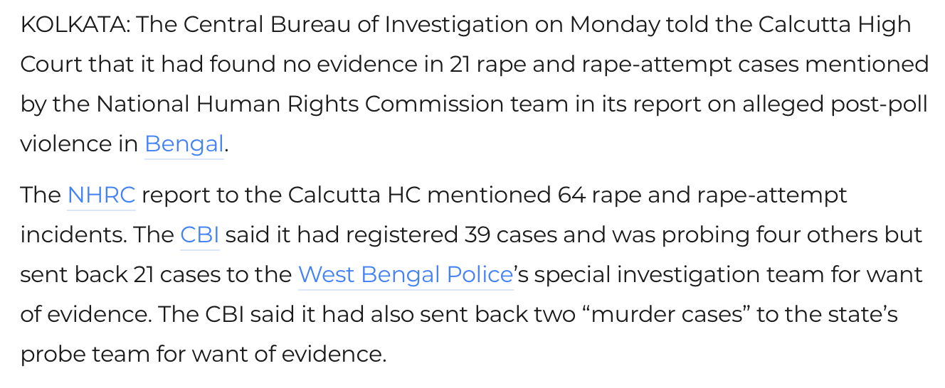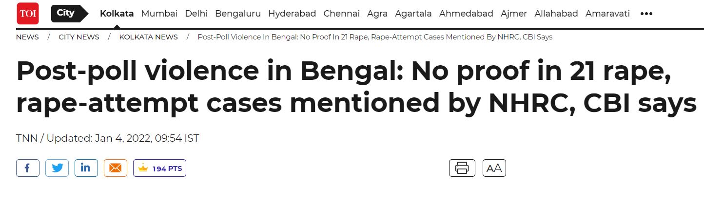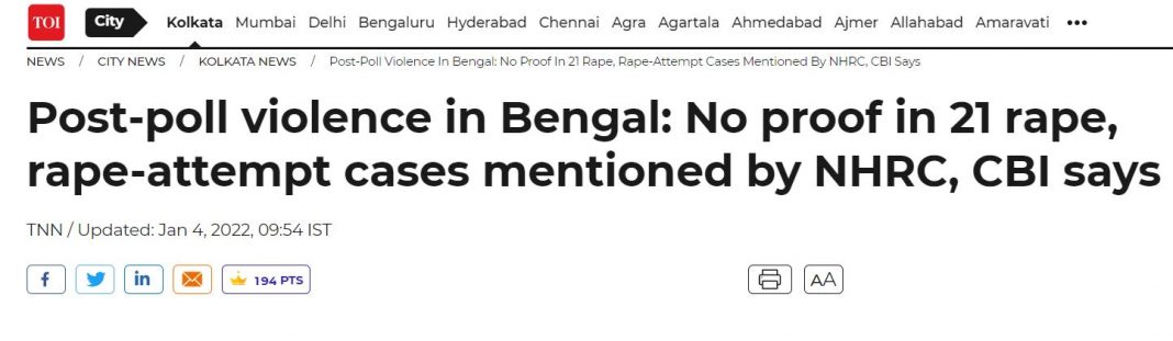 Times of India report published on January 4 that was headlined: “Post-poll violence in Bengal: No proof in 21 rape, rape-attempt cases mentioned by NHRC, CBI says”.