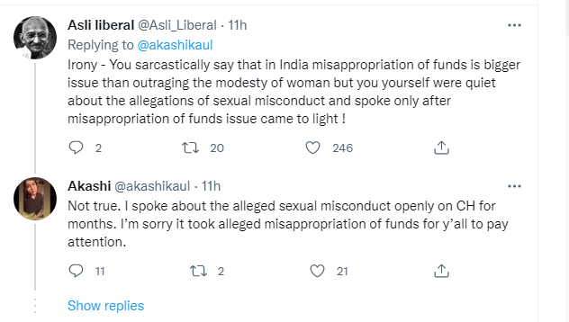“Irony – You sarcastically say that in India misappropriation of funds is a bigger issue than outraging the modesty of woman but you yourself were quiet about the allegations of sexual misconduct and spoke only after misappropriation of funds issue came to light!” wrote one Twitter user. In her defence, Akashi Kaul claimed that she openly spoke about the allegations on Clubhouse for months.