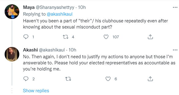 Another user asked, “Haven’t you been a part of their/ his clubhouse repeatedly even after knowing about the sexual misconduct part?” Instead of directly responding to the question, Kaul stated, “No. Then again, I don’t need to justify my actions to anyone but those I’m answerable to. Please hold your elected representatives as accountable as you’re holding me.”