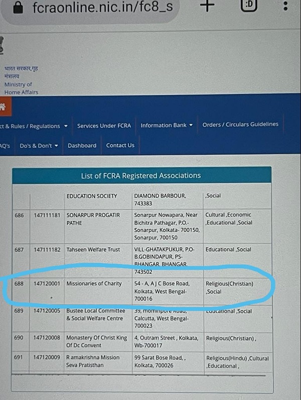 The Ministry of Home Affairs (MHA) on January 7 restored the FCRA registration of Missionaries of Charity (MoC), the Catholic religious congregation set up by Mother Teresa. This was done after the NGO submitted the necessary documents to the concerned department.