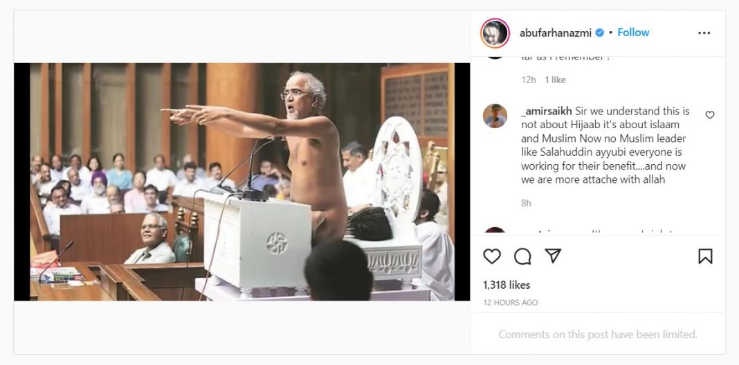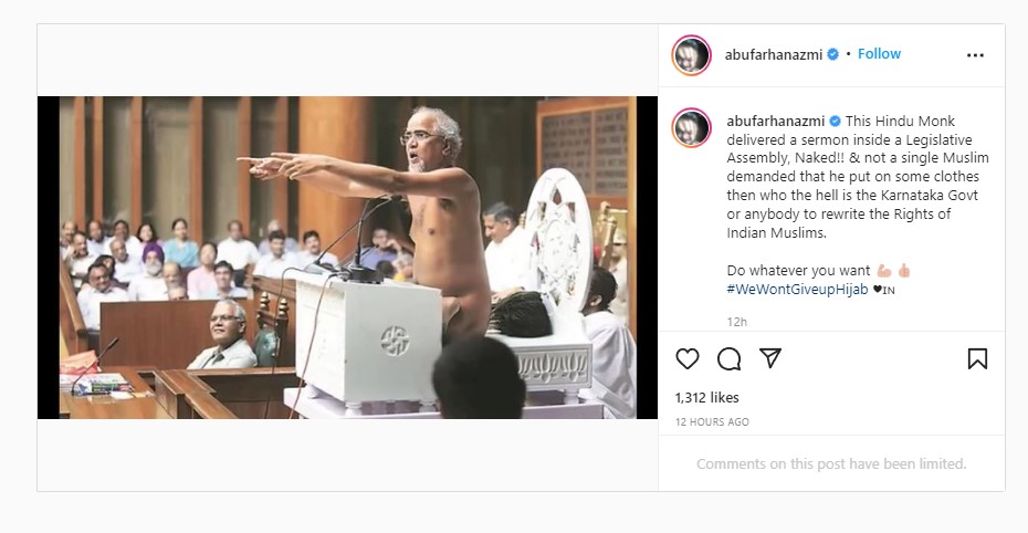 Abu Farhan Azmi, a Maharashtra-based Samajwadi Party politician, posted a photo of Jain monk Tarun Sagar on Instagram and ridiculed him for addressing the Haryana legislative assembly naked. He maintained that if a “Hindu” is permitted to be nude at a public ceremony, why can’t a Muslim lady wear a headscarf to school in Karnataka?