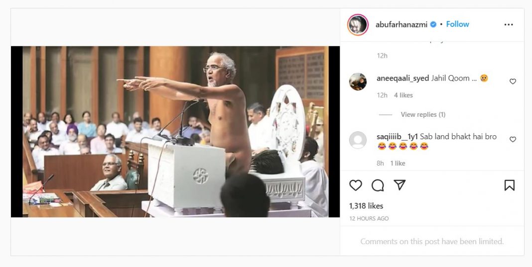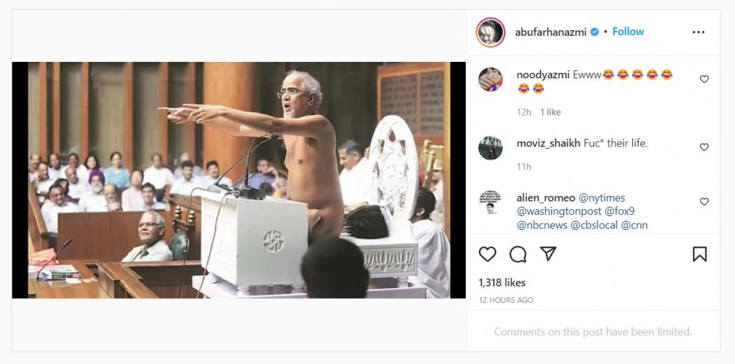 The photo which Farhan Azmi has shared is of Jain monk Tarun Sagar addressing the Haryana assembly. Tarun Sagar was a Jain monk of the Digambar community and these monks do not wear clothes. Back in 2019, there were cases filed against music composer Vishal Dadlani and Robert Vadra’s brother in law Tehseen Poonawalla for hurting religious sentiments by mocking the Jain monk.