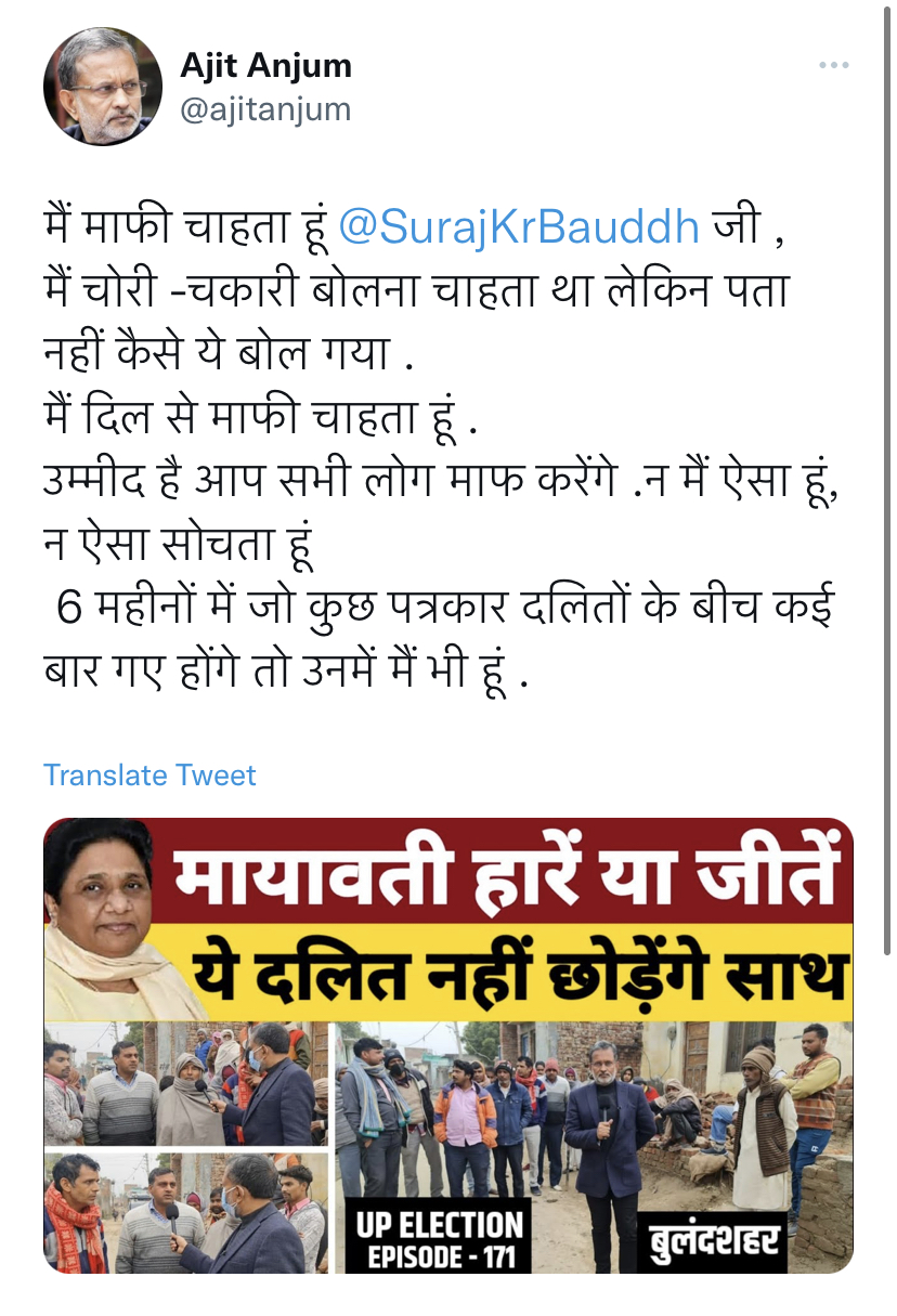 “I’m sorry @SurajKrBauddh, I wanted to speak “chori-chakari” but I do not know how it was said. I sincerely apologize. I hope you all will forgive me. I am neither like this nor think so I am also among the few journalists who may have gone among Dalits many times in the last 6 months,” Anjum tweeted.