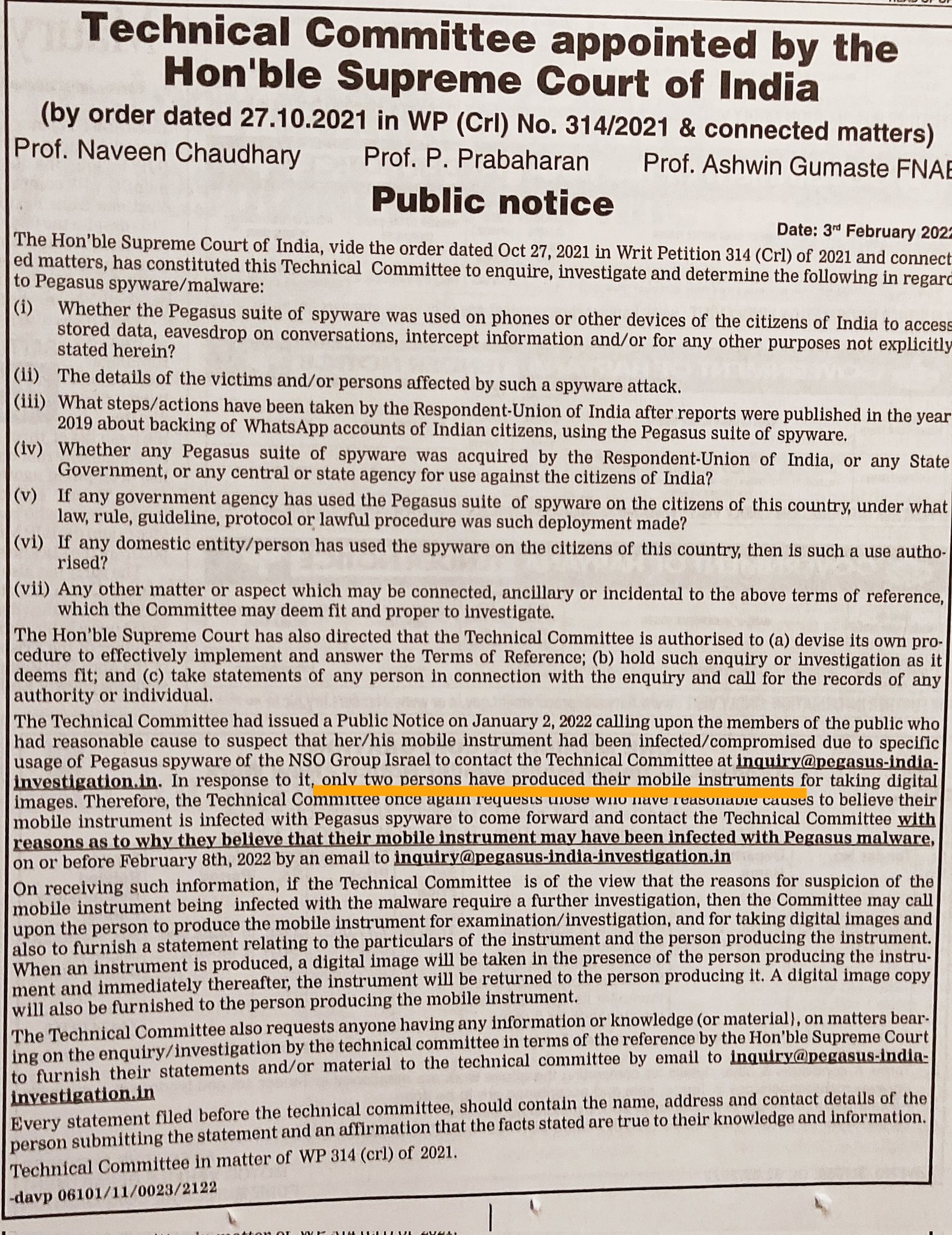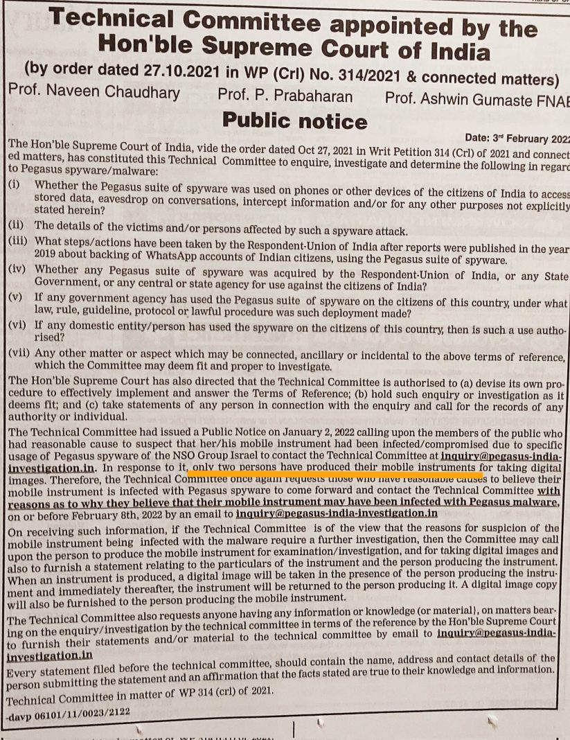 On January 2, 2022, the technical committee appointed by the Supreme Court had issued a public notice asking citizens and alleged victims of the Pegasus snoop gate to come forward and contact the panel if they suspected that their mobile devices were infected by Pegasus malware.