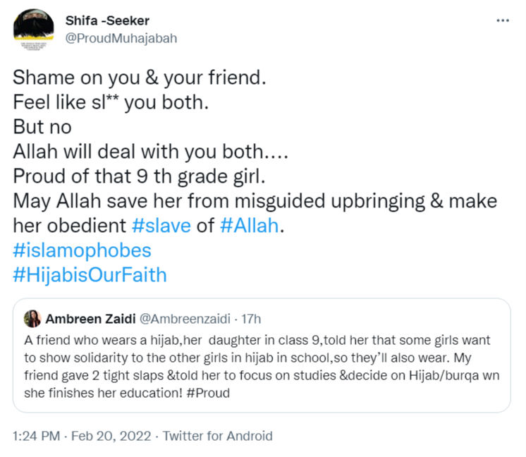 He tweeted, “Shame on you & your friend. Feel like sl** you both. But no. Allah will deal with you both….Proud of that 9th-grade girl. May Allah save her from misguided upbringing & make her obedient #slave of #Allah.”