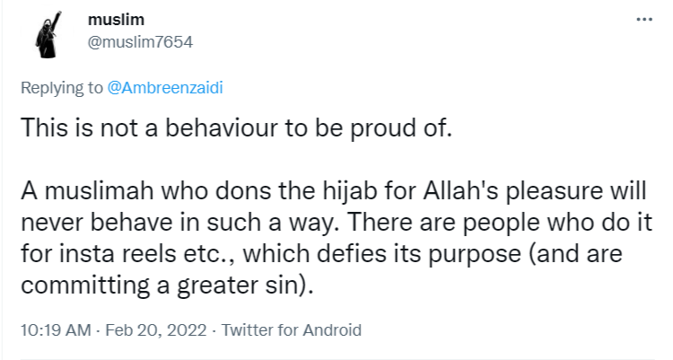 “This is not a behaviour to be proud of. A muslimah who dons the hijab for Allah’s pleasure will never behave in such a way. There are people who do it for insta reels etc., which defies its purpose (and are committing a greater sin),” wrote another Islamist.