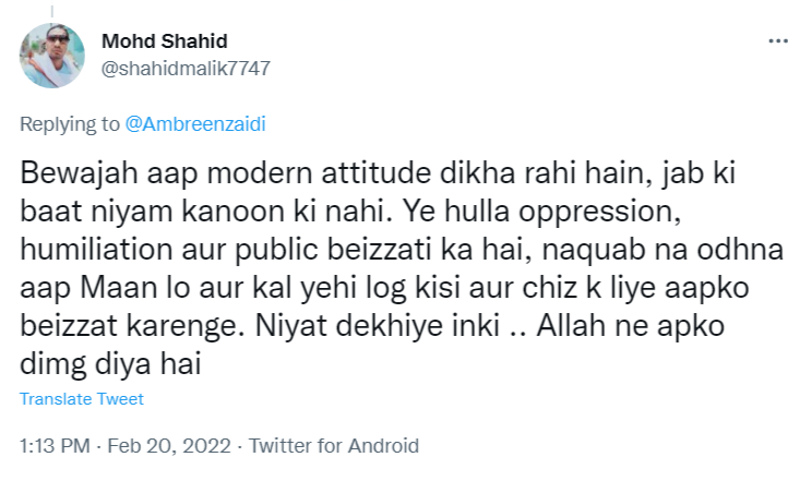 One Mohammed Shahid remarked, “You are showing ‘modern attitude’ for no reason. This is not about rules but oppression, public humiliation and insults. If you agree to not wear niqab, then, they (Hindus) will shame you for some other reason. Look at their nature. Allah has given you brain. Use it.”