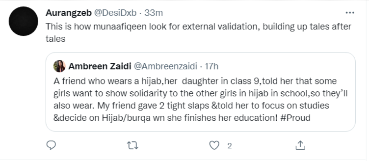 In a tweet, Zaidi wrote, “A friend who wears a hijab, her daughter in class 9, told her that some girls want to show solidarity to the other girls in hijab in school, so they’ll also wear. My friend gave 2 tight slaps & told her to focus on studies &decide on Hijab/burqa when she finishes her education.”