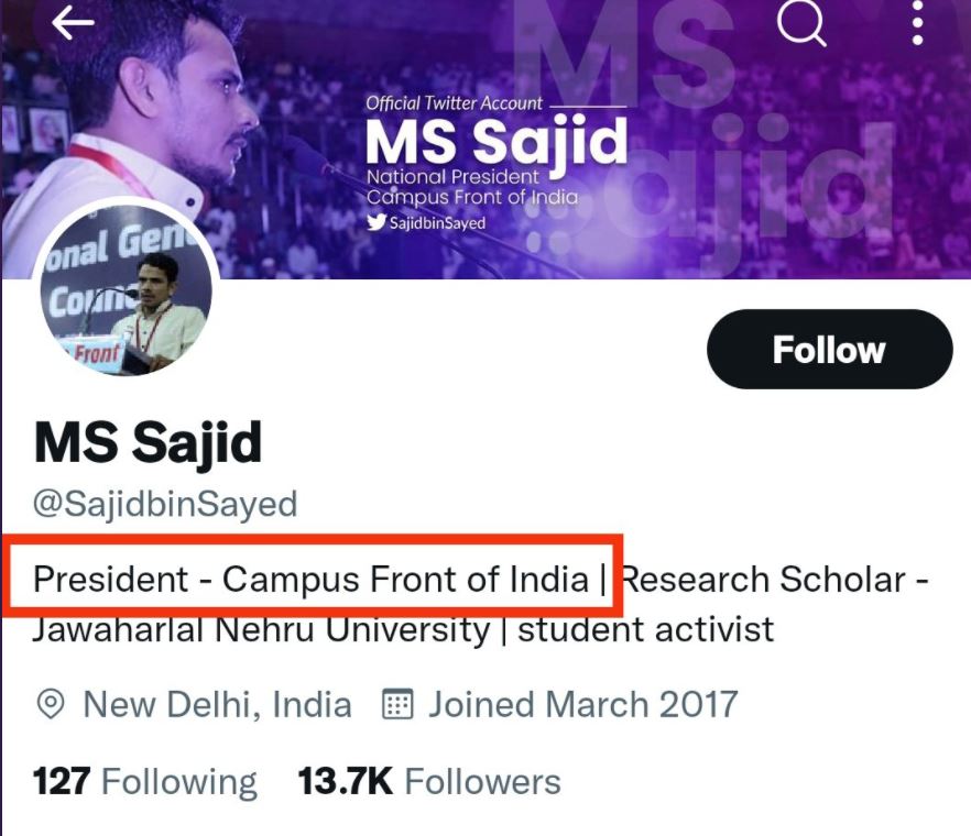 MS Sajid identifies himself as the president of the Campus Front of India(CFI), the notorious student wing of the radical Islamist outfit Popular Front of India.