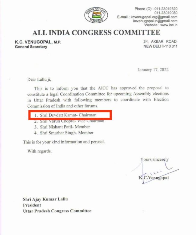 It must be mentioned that Devadatt Kamat was appointed as the Chairman of the legal coordination committee of the Congress party in the run-up to the Uttar Pradesh elections. The committee was formed to coordinate with the Election Commission of India (ECI) in light of the Assembly elections. His appointment was made by the Central Committee of the Congress.