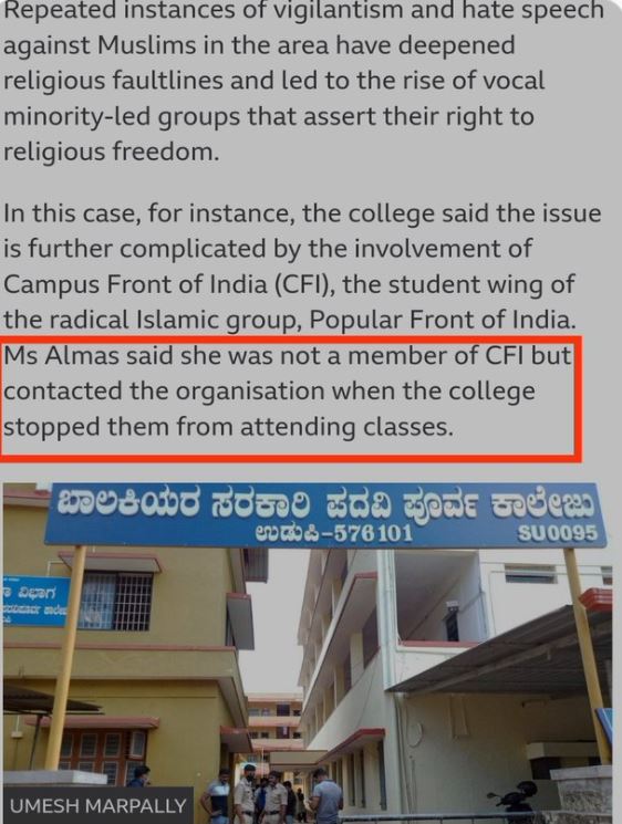 First, Patal shared the screenshot of Almas’ interview with BBC, where she claimed that they were not members of CFI but were contacted only after the Hijab controversy. BBC, in its report published on January 22, 2022, titled: “Udupi hijab issue: The Indian girls fighting to wear hijab in college”, had quoted Almas as saying that “she was not a member of CFI but contacted the organisation when the college stopped them from attending classes.”