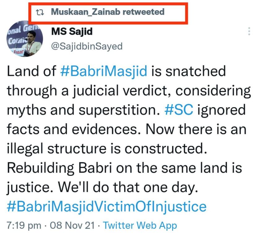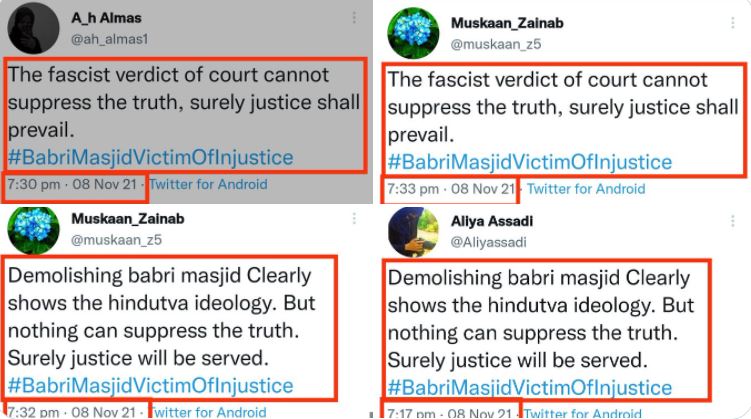To reinforce how these women have continuously advocated and spread the anti-India propaganda peddled by the radical Islamist organisation CFI, the activist further shared screenshots of how they went on to collectively popularize the hashtag started by CFI on 8 November 2021 to disrepute the Supreme Court’s decision putting an end to the decades-old land dispute in Ayodhya.