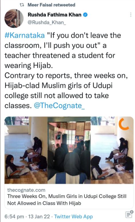 In his next few Tweets, the activist goes on to bust the lie spread by one of the Muslim students who spearheaded the hijab controversy. She had claimed that they were not part of CFI and that the radical organisation contacted her only after the hijab controversy broke out.