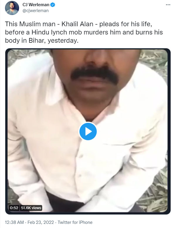 After the incident, a video went viral on social media in which it was presented as if the case was of a mob lynching. The incident was given a communal angle and it was projected that the murder was linked to killing a cow. Islamist and self-proclaimed journalist CJ Werleman also shared the video and alleged, “This Muslim man – Khalil Alan – pleads for his life, before a Hindu lynch mob murders him and burns his body in Bihar, yesterday.”