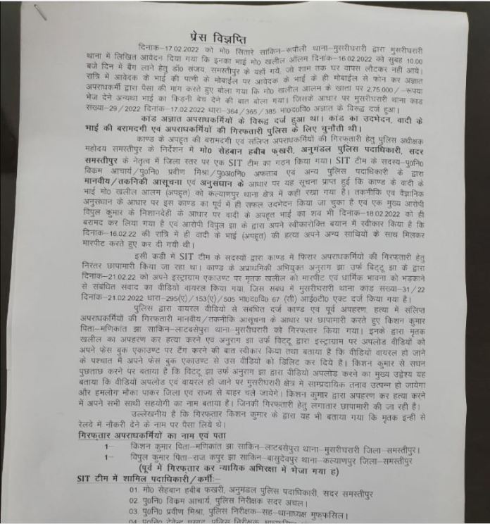 During a press conference on the matter, the Police issued a press release to inform the actual details of the incident. The Police said in the press release that one of the accused who was arrested by the Police, Vipul Jha, had confessed that he, along with four others, had killed Khaleel on the night of February 16. Special Investigation Team has been constituted in the matter.
