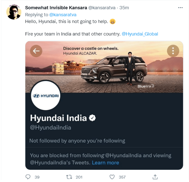 Indian netizens were miffed at the brazen interference in India’s geopolitical affairs and dissemination of Pakistani government propaganda by the South Korean automotive manufacturer. However, on questioning Hyundai India whether it endorsed the stand of Hyundai Pakistan, the firm responded by blocking the Indian netizens.