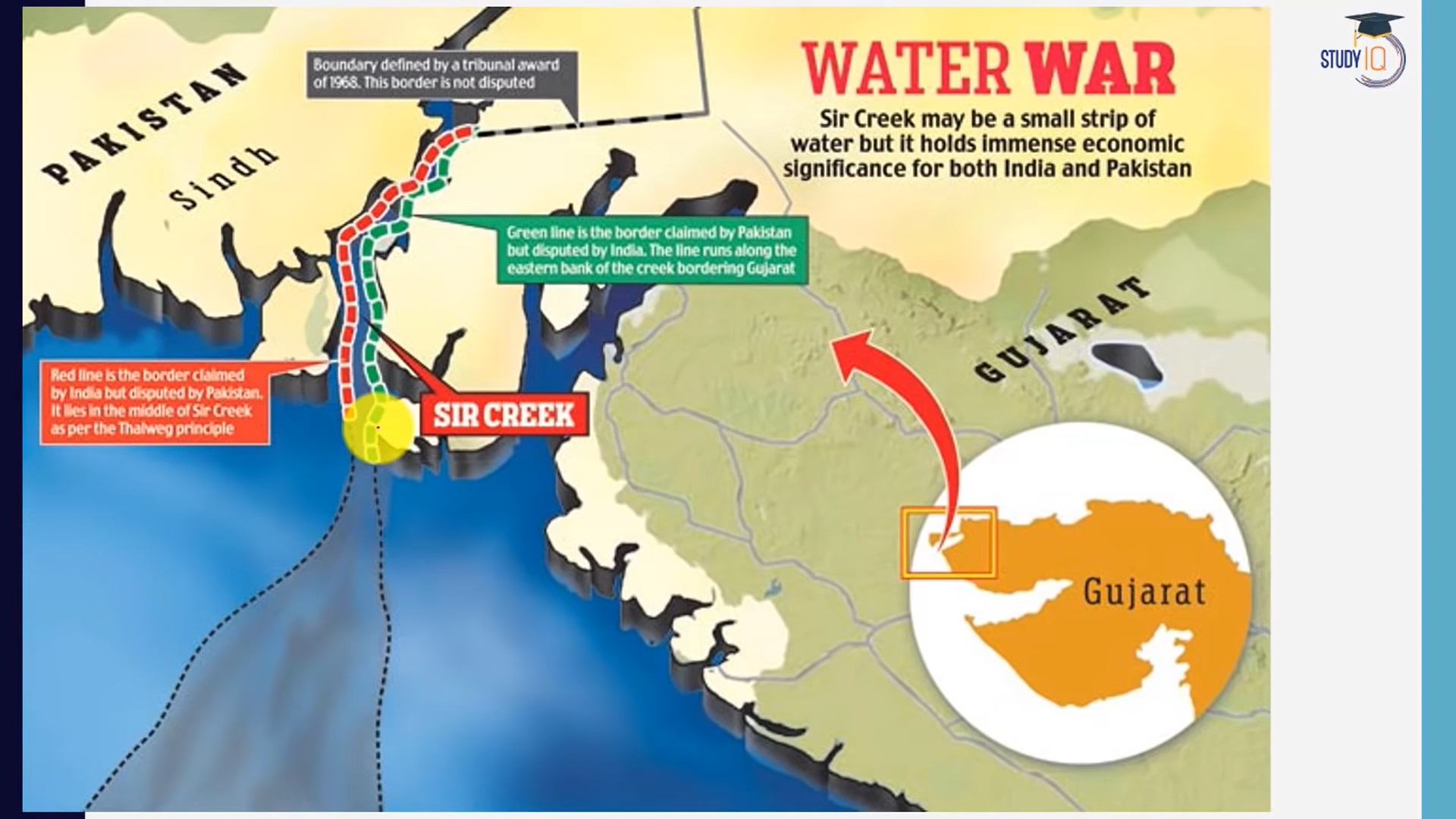 According to the 1914 agreement called the Bombay Government Resolution of 1914 demarking the borders between the states, Pakistan claims that the whole of the creek belongs to Pakistan. India, however, follows Thalwegs Principle which is applied while fixing the international boundaries in the water bodies. According to this principle, if the water body is navigable then the boundary between the two countries can be considered only in the middle of the water channel. Therefore India maintains that half of the channel belongs to India and Pakistan must not cross the water border.