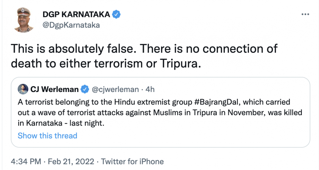 “This is absolutely false. There is no connection of death to either terrorism or Tripura,” he said. He was responding to tweet by CJ Werleman, so-called journalist and also an apologist of Islamic terror. Werleman in his tweet, without any shred of evidence, had tweeted, “A terrorist belonging to the Hindu extremist group #BajrangDal, which carried out a wave of terrorist attacks against Muslims in Tripura in November, was killed in Karnataka – last night.”