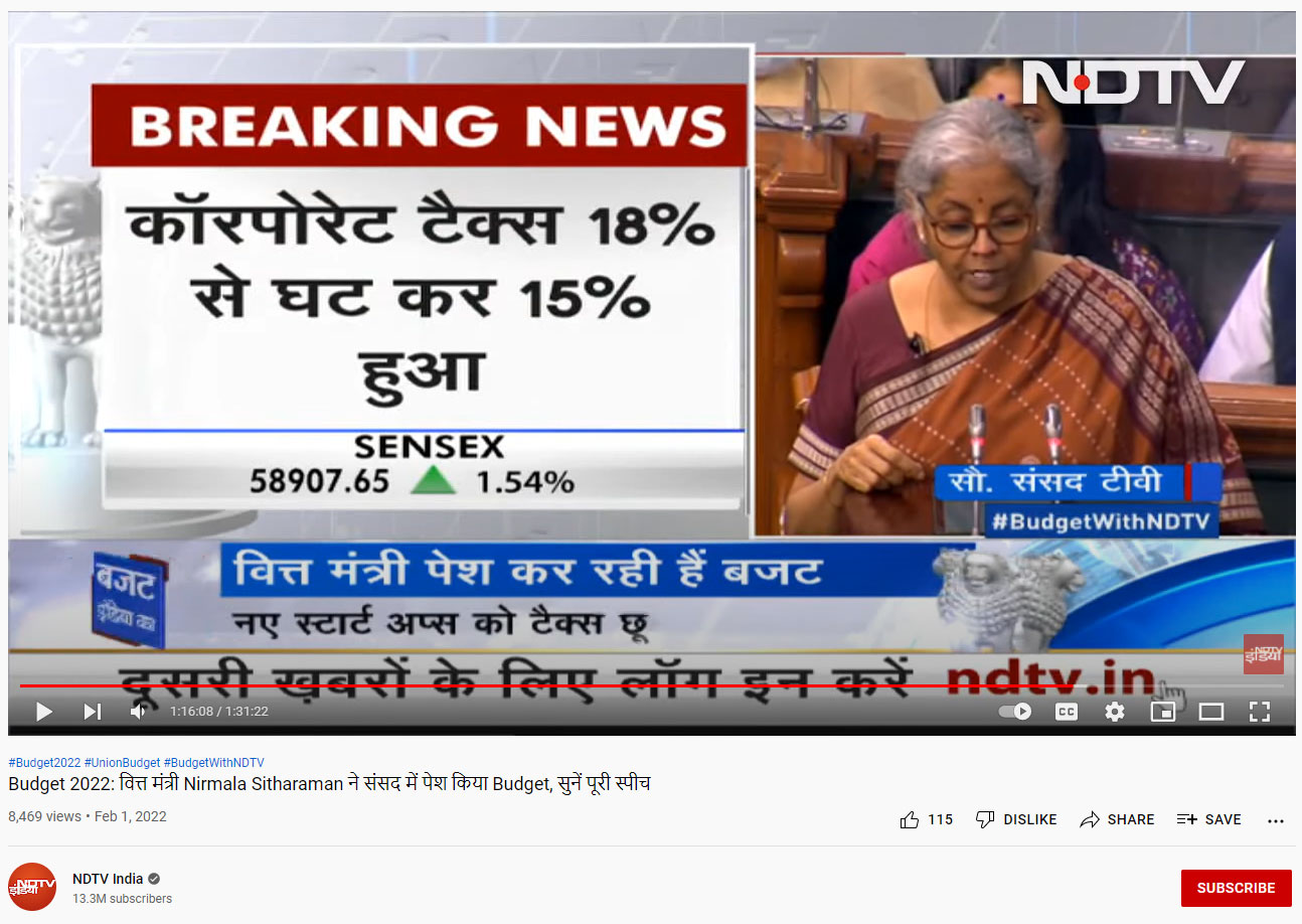 News channel NDTV’s screenshot was shared by PIB in the tweet while debunking the claim. The budget speech that NDTV telecasted live on Tuesday is available on its YouTube channel. At the 1:16 timestamp, the misleading note that NDTV ran is still available in the video.