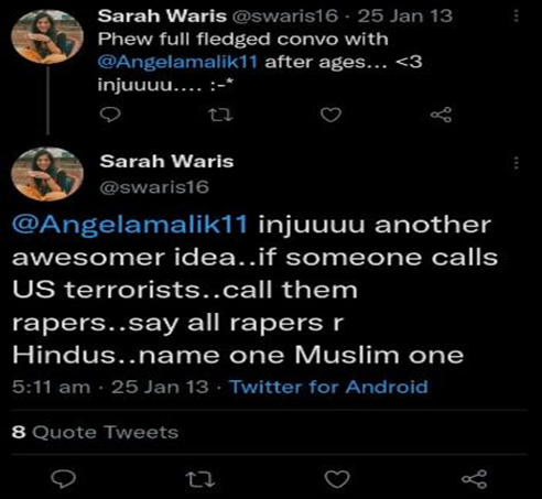 Sarah’s work has appeared in a number of well-known left-liberal publications, including The Quint and NDTV. Sarah publicly referred to Hindus as rapists in a 2013 tweet, which has now been deleted.