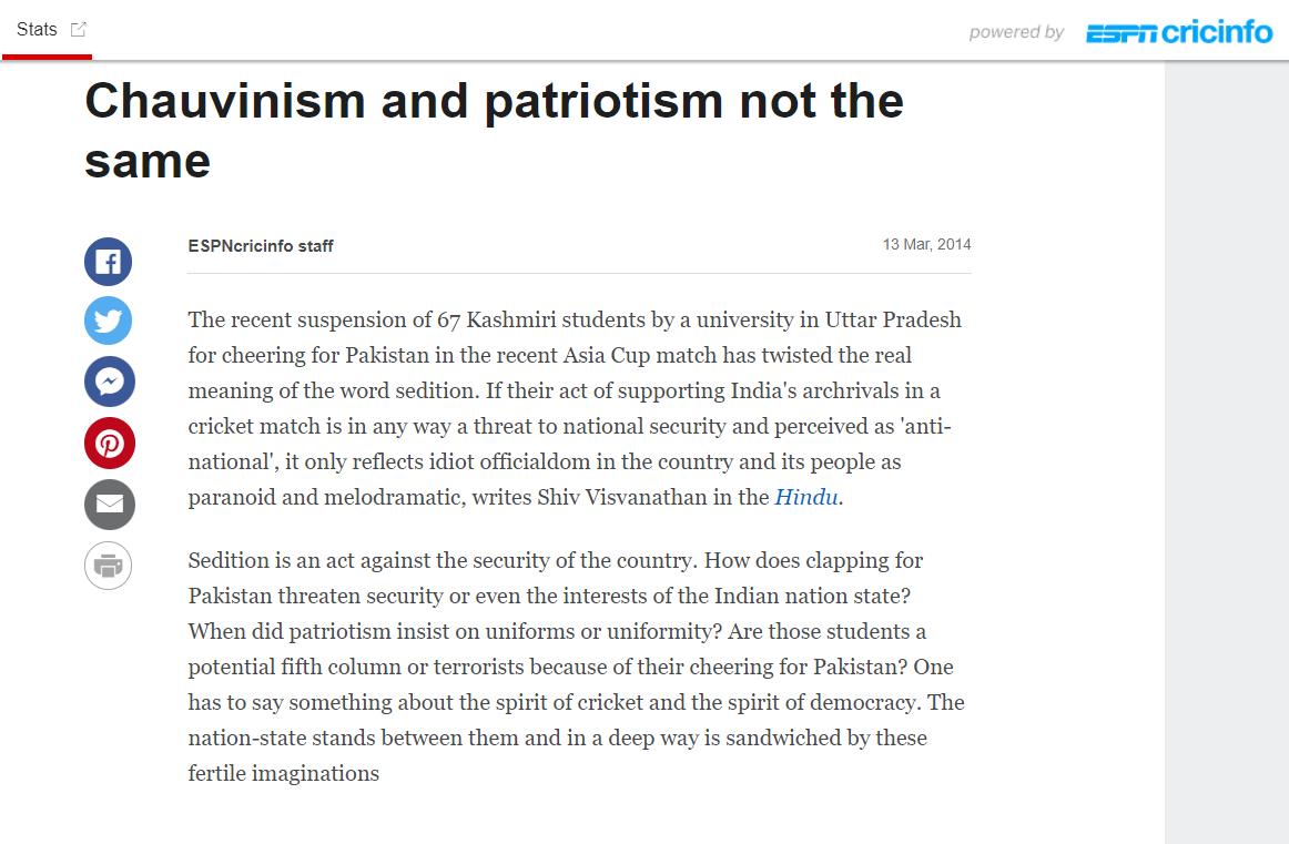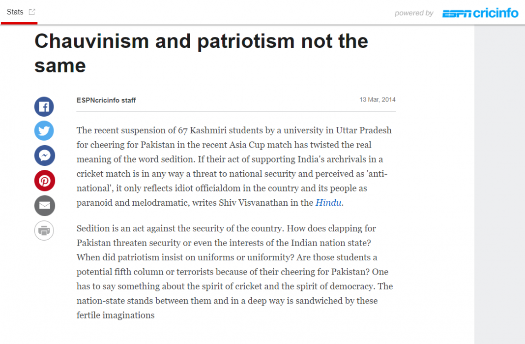 A report by ESPN back in 2014 stated that the sedition act is against the security of the country. Surprisingly, such fervent opinions have begun to find traction on sports platforms as well! Similar to CNBC, they resorted to the same strategy of portraying India in a bad light just because some Muslims, who celebrated the victory of Pakistan in a cricket match and raised anti-India slogans were charged with sedition. The report quoted Shiv Visvanathan, who wrote in The Hindu that such action “reflects idiot officialdom in the country and its people as paranoid and melodramatic.”
