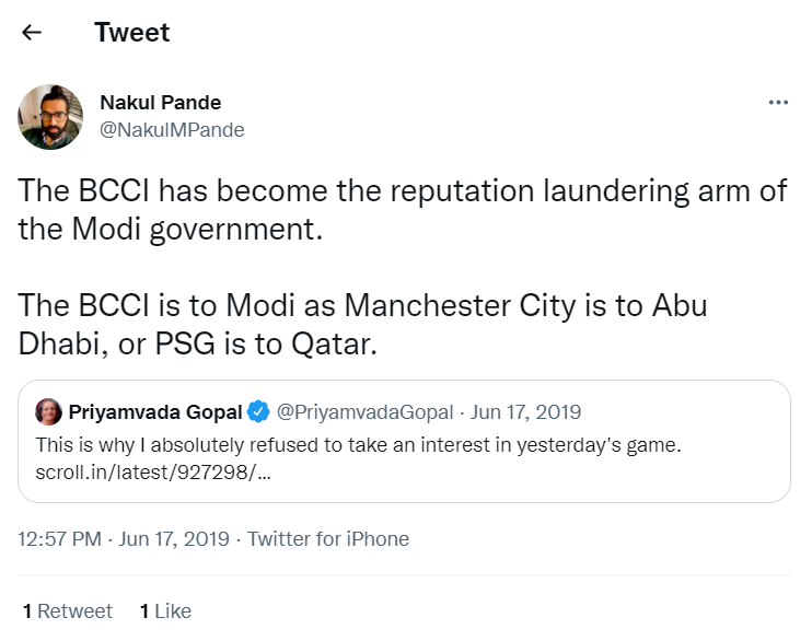 In a tweet made on 17 June 2019, he wrote, “The BCCI has become the reputation laundering arm of the Modi government. The BCCI is to Modi as Manchester City is to Abu Dhabi, or PSG is to Qatar.”