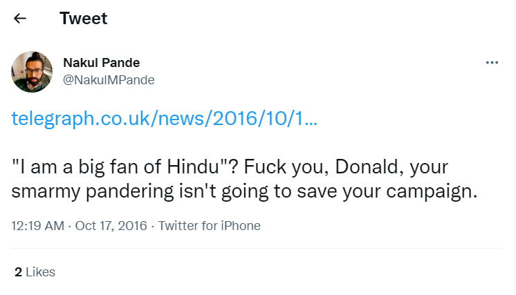 In a tweet made in 2016, he wrote, “I am a big fan of Hindu”? Fuck you, Donald, your smarmy pandering isn’t going to save your campaign.”