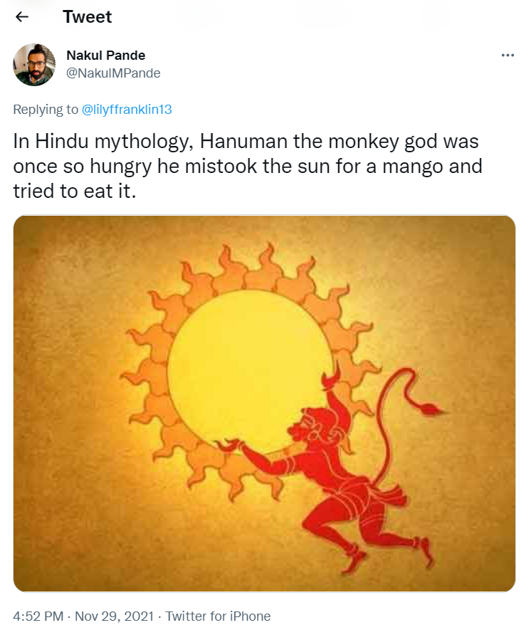 In another Tweet, he mocked the belief of Hindus by saying, “In Hindu mythology, Hanuman the monkey god was once so hungry he mistook the sun for a mango and tried to eat it.”