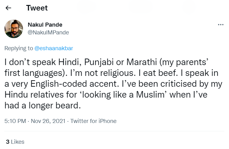 Another tweet reads, “I don’t speak Hindi, Punjabi or Marathi (my parents’ first languages). I’m not religious. I eat beef. I speak in a very English-coded accent. I’ve been criticized by my Hindu relatives for ‘looking like a Muslim’ when I’ve had a longer beard.”