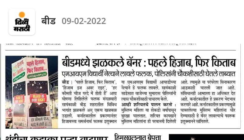 The banners supporting Hijab were put up in various places in Beed including Bashir Ganj Chowk, Shivaji Maharaj Chowk, Rajuriwes Complex etc. The banners read “Pahle Hijab, fir Kitab” which means Hijab first, then the book, and “Hijab is our right”, and “Har keemati cheez parade me hoti hai” which means “every precious thing is kept covered”. The banners were erected by Farooq Ilukman, a leader of the MIM student front, in support of the hijab after the Karnataka incident.