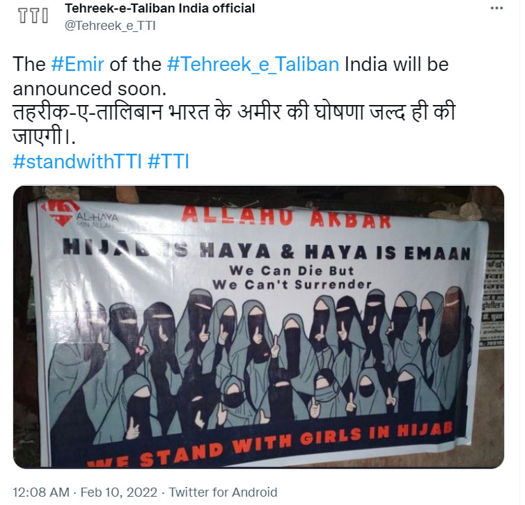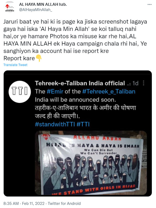 There was a photograph of a poster in the Tweet that was in support of the hijab. The poster read, “Hijab is haya & Haya is Emaan. We can die, but we can’t surrender. We stand with girls in hijab.” The poster also had the logo of Al-Haya-Min-Allah, which, according to its Twitter bio, is a month-long “Haya campaign” allegedly to “spread awareness”. The group has come out in support of hijab-wearing girls. Interestingly, the group being Al-Haya-Min-Allah has distanced itself from TTI and called it an account made by “Sanghis”.