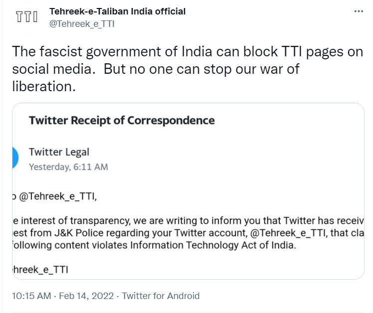 In the latest tweet, TTI called the Indian government fascist and said, “The fascist government of India can block TTI pages on social media. But no one can stop our war of liberation.”