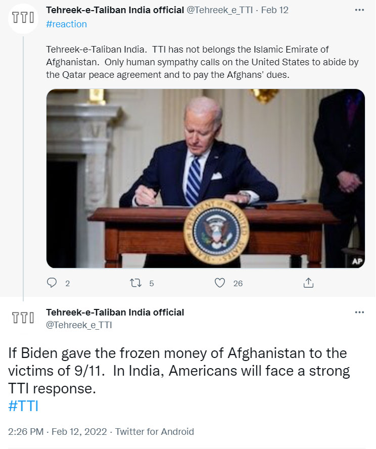 On February 12, TTI alleged if Biden gave Afghanistan’s money to someone else, the Americans living in India would face a strong response from the organization. TTI’s response came after US President Biden announced that America would equally divide $7 Billion of Afghanistan’s aid money to 9/11 victims and humanitarian organizations working in Afghanistan.