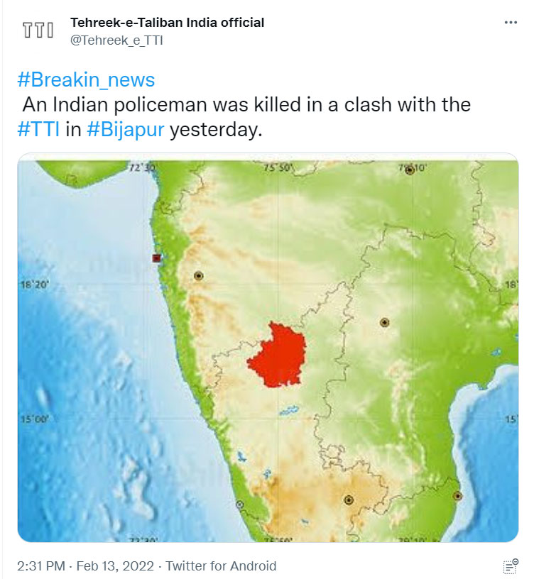 On February 13, TTI claimed to have killed a police officer in Bijapur on Saturday. The location marked on the map was Karnataka. Contrary to the claims, the incident did not take place in Bijapur, Karnataka, but in Bijapur, Chattisgarh, where a CRPF soldier lost his life during an exchange of fire with Naxals.