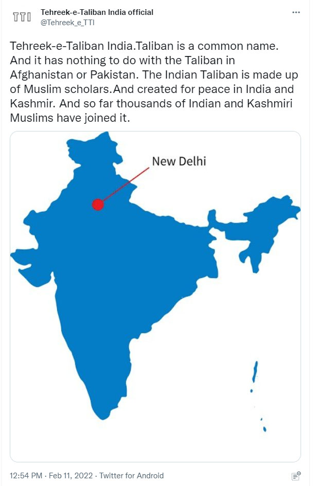 In its tweets, TTI claims that Taliban is a common name and it has nothing to do with Taliban in Afghanistan or Pakistan. It said, “The Indian Taliban is made up of Muslim scholars. And created for peace in India and Kashmir. And so far, thousands of Indian and Kashmiri Muslims have joined it.” It used a distorted map of India with the tweet.