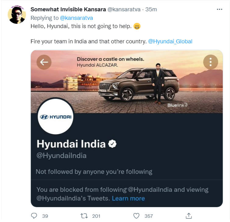 Similarly, several other users have reported they were blocked by Hyundai India for questioning Hyundai’s Pakistan’s post on Kashmir solidarity day.