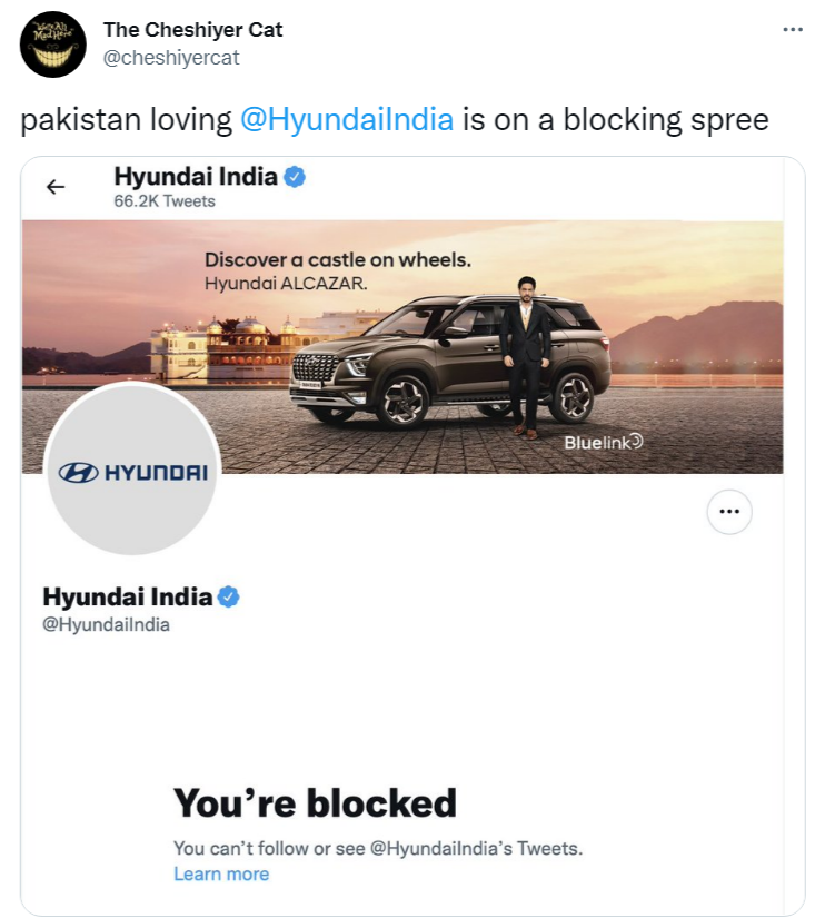 Another Twitter user (@cheshiyercat), who was also blocked by the automotive manufacturer, pointed out how Hyundai India had been on a blocking spree after Indian Twitter users slammed the company for the post by Hyundai Pakistan.