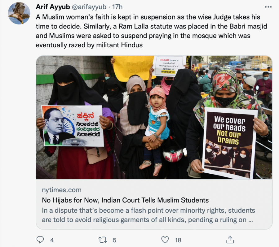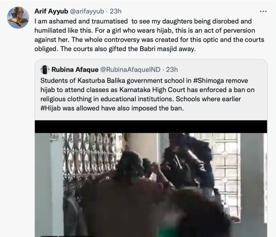 Continuing his rant, Arif Ayyub falsely claimed the daughters were “disrobed and humiliated” by the state. Comparing the ongoing ban on hijab in schools to the Babri Masjid controversy, the Islamist said that the whole controversy had been created to humiliate Muslim girls, which according to him, is being obliged by the courts.