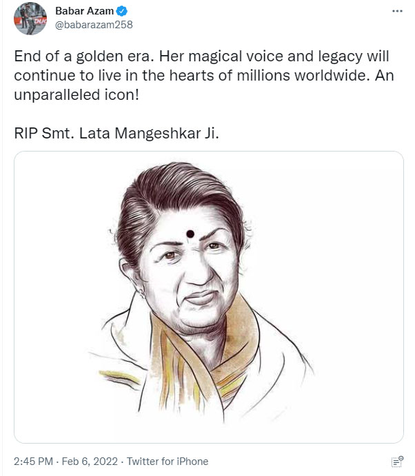 Pakistan cricketer Babar Azam wrote, “End of a golden era. Her magical voice and legacy will continue to live in the hearts of millions worldwide. An unparalleled icon!”