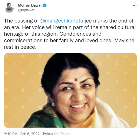 Mohsin Dawar, National Assembly member, said, “The passing of Lata Mangeshkar jee marks the end of an era. Her voice will remain part of the shared cultural heritage of this region. Condolences and commiserations to her family and loved ones. May she rest in peace.”