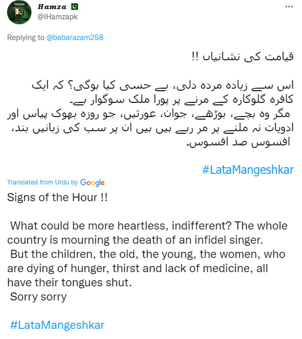 His tweet did not go well with the Islamists who spewed hate under in tweet in the comments. Twitter user Hamza said, “What could be more heartless, indifferent? The whole country is mourning the death of an infidel singer. But the children, the old, the young, the women, who are dying of hunger, thirst and lack of medicine, all have their tongues shut.” The tweet was in Urdu.