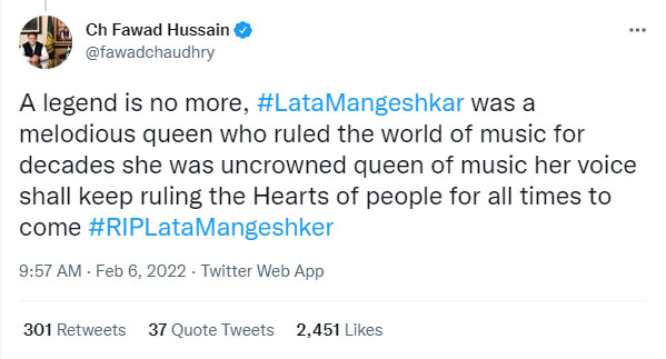 Fawad Hussain, Federal Minister of Information and Broadcasting, said, “A legend is no more, Lata Mangeshkar was a melodious queen who ruled the world of music for decades she was the uncrowned queen of music her voice shall keep ruling the Hearts of people for all times to come.”