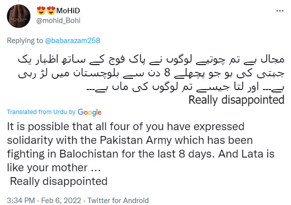 Another user Mohid expressed his disappointment as Azam had not talked about the Pakistani Army fighting in Balochistan.