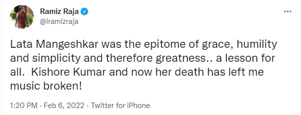 Former Pakistani cricketer Ramiz Raja said, “Lata Mangeshkar was the epitome of grace, humility and simplicity and therefore greatness.. a lesson for all. Kishore Kumar, and now her death has left me music broken!”